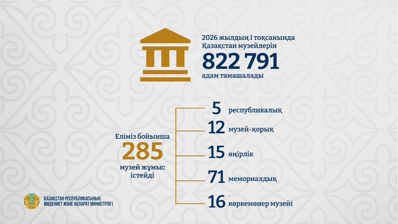 Қазақстанда музей мәдениетіне қызығушылық артып келеді. 2026 жылдың алғашқы үш айының қорытындысы бойынша ел музейлерін 822 791 адам тамашалаған. Мұндай көрсеткішке музей инфрақұрылымын дамыту, экспозицияларды жаңарту және көпшілікке, әсіресе жастар мен туристерге арналған заманауи форматтарды енгізу жұмыстарының нәтижесінде қол жеткізілді, деп хабарлайды JANABASTAU.KZ.
