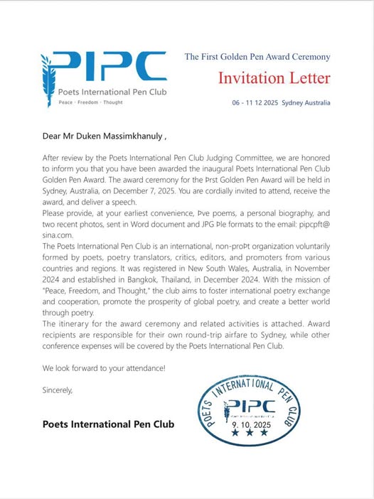Құрметті Дүкен Мәсімханұлы мырза, Poets International Pen Club төрелік комитетінің қарауынан кейін, Сізге Poets International Pen Club ұйымының алғашқы «Алтын қалам» халықаралық сыйлығының иегері атанғаныңызды қуана хабарлаймыз.