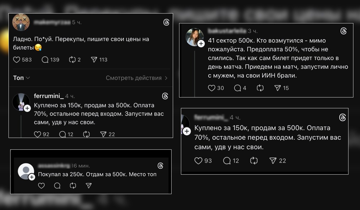 Threads әлеуметтік желісіндегі хабарландыруға қарасақ, алыпсатарлар қазір 1 билетті 500 мың теңгеден сатуды бастап кеткен.