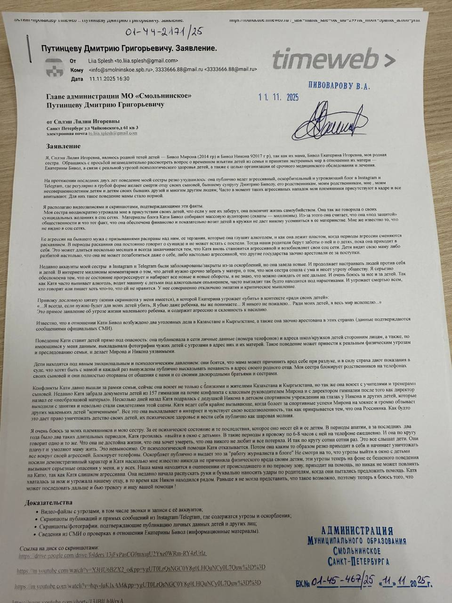 Желіде Екатеринаның дәл осы тексеріске шақырылуына себеп болды делінген шағым құжатының фотосы да тарады. Онда: