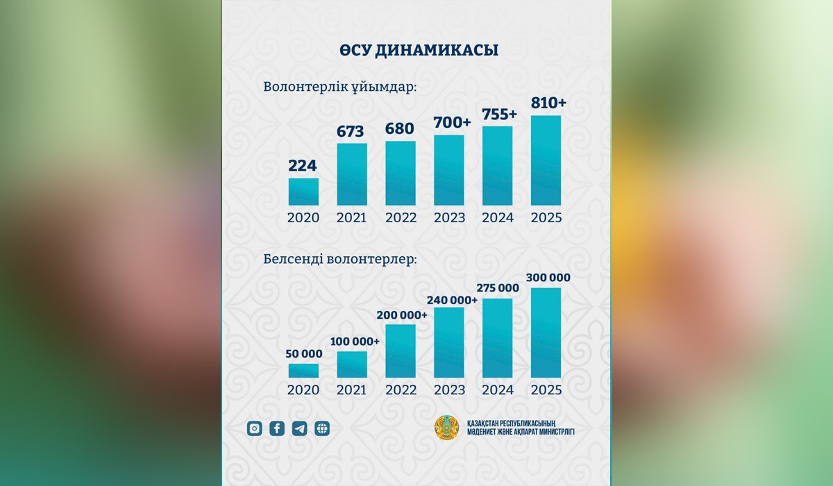 Министрдің айтуынша, бүгінгі таңда волонтерлік қызмет Қазақстандағы қоғамдық өмірдің ажырамас бөлігіне айналған. Волонтерлер мәдениет пен білім, экология мен медицина, әлеуметтік қолдау мен қайырымдылық сияқты маңызды салалардың дамуына елеулі үлес қосып келеді.