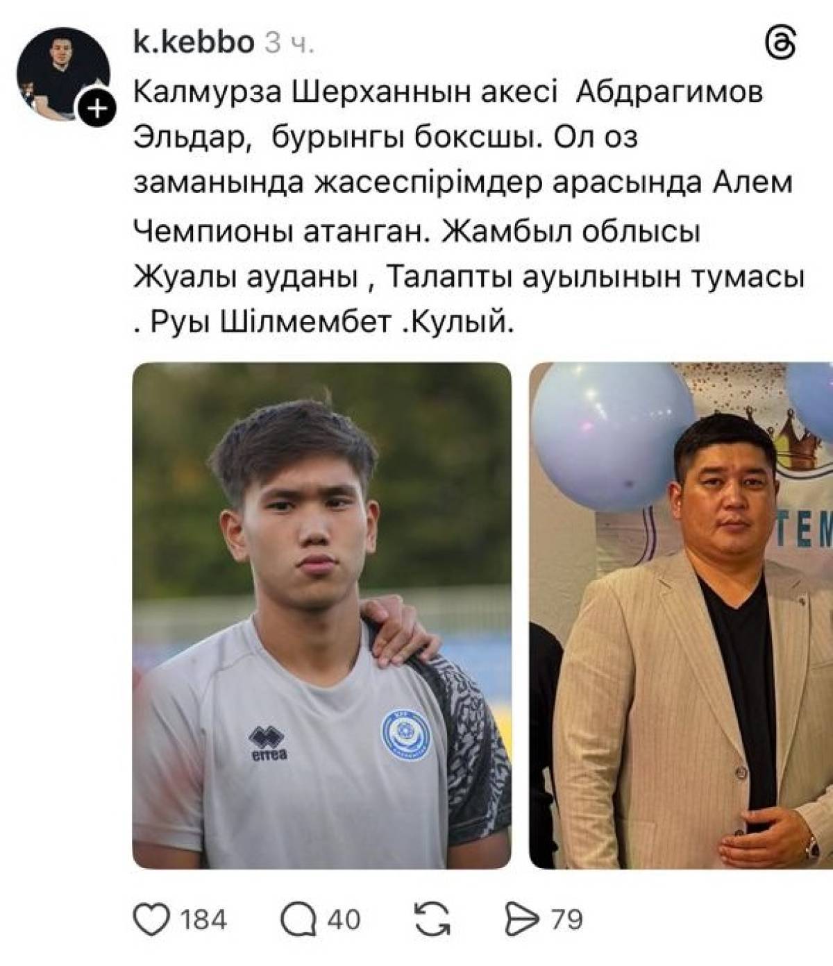 Әлеуметтік желіде «Қайрат» футбол клубының 18 жастағы қақпашысы Шерхан Қалмырзаның әкесі туралы ақпарат тарады, деп хабарлайды JANABASTAU.KZ ақпарат агенттігі Sportinside.kz-ке сілтеме жасап.